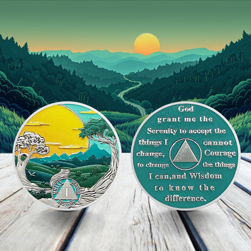 The obverse side of recovery anniversary token features big sun, tree, mountain. Three Legacies motto: ''Unity, Service, Recovery'', special laser number signifying length of sobriety.