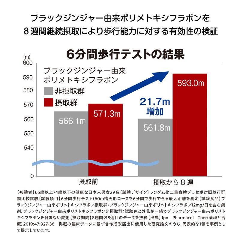 このサプリメントには年齢とともに低下する脚の筋力に作用することにより、中高年の方の歩く力を維持することが報告されている成分「ブラックジンジャー由来ポリメトキシフラボン」が配合されています。加齢によっておとろえる足の筋力を維持して、楽しい歩きで毎日をサポート!