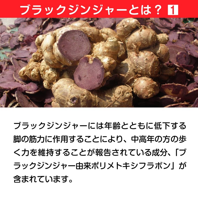 - 1日2粒のイキイキ生活!●名称:歩行力の維持に役立つサプリ ブラックジンジャーエキス末含有加工食品 ●原材料名:食用油脂(国内製造)、ブラックジンジャーエキス末(ブラックジンジャーエキス、デキストリン)、共役リノール酸含有油脂、ショウガエキス(食用油脂、ショウガエキス)、L- カルニチン、 L-酒石酸塩、黒胡椒エキス末/ゼラチン、グリセリン、シクロデキストリン、グリセリン脂肪酸エステル、ミツロウ、カカオ色素、植物レシチン(大豆由来) ●内容量:28.2g(470mg×60粒) ※本品は、疾病の診断、治療、予防を目的としたものではありません。 ※食生活は、主食、主菜、副菜を基本に、食事のバランスを。※パッケージの写真はイメージです。変更になる場合があります。