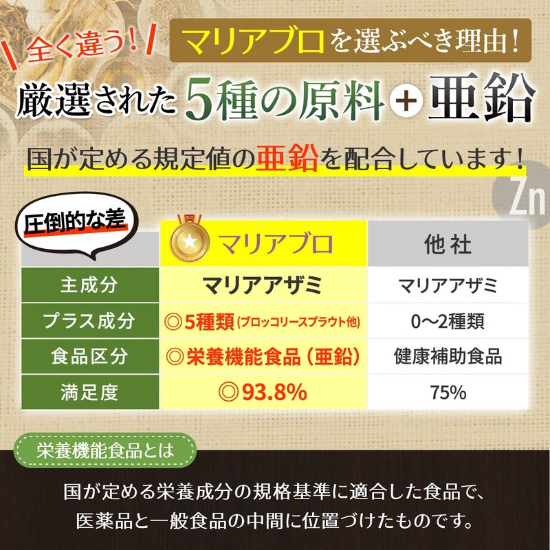 - ブロッコリースプラウト→スーパーフードの象徴であり、 スルフォラファンを豊富に含有しています。 スルフォラファンは、ファイトケミカルの一種です。 高麗人参→漢方薬としてもおなじみで、 サポニンを豊富に含有しています。 黒胡椒(バイオペリン)→栄養の吸収力をサポートします。 肝臓エキス→BCAA(バリン・ロイシン・イソロイシン)、 オルニチンなどのアミノ酸が豊富に含まれています。 亜鉛→ミネラルの鉄板です。 外食が多い、無理なダイエット、お酒を良く飲む方は、 亜鉛が不足しているかもしれません。 本製品マリアブロは、 国が定める規定値の亜鉛を配合している栄養機能食品です。 栄養機能食品とは、 国が定める栄養成分の規格基準に適合した食品で、 医薬品と一般食品の中間に位置づけたものです。
