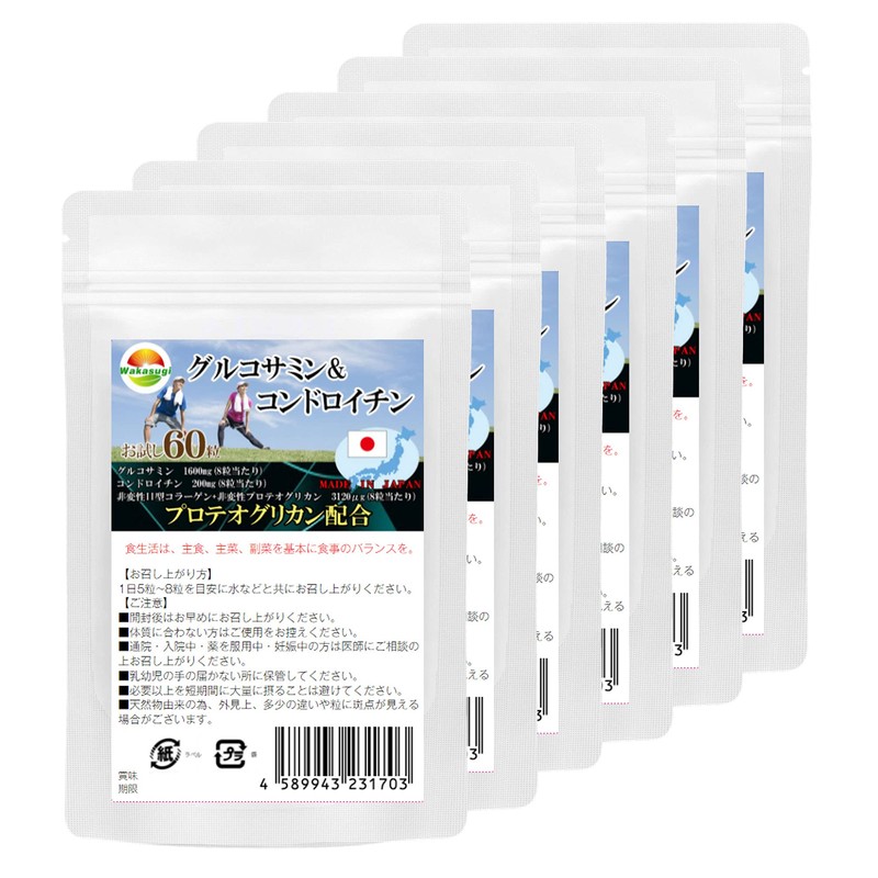 グルコサミン&コンドロイチン 60粒 6袋セット計360粒 プロテオグリカン新配合 8粒当たり グルコサミン1600mg配合 コンドロイチン200mg配合 非変性II型コラーゲン+非変性プロテオグリカン 3120μg配合