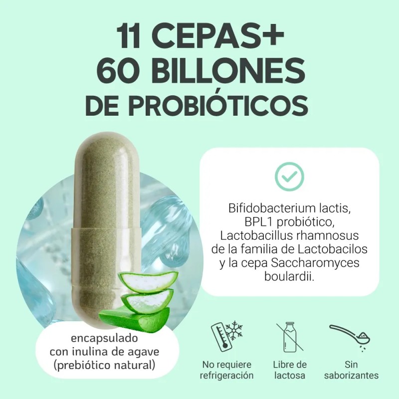 - Cada Cápsula contiene: 60 Billones de Probióticos con 11 Cepas, Prebióticos (Inulina de Agave y Aloe Vera o Sábila).