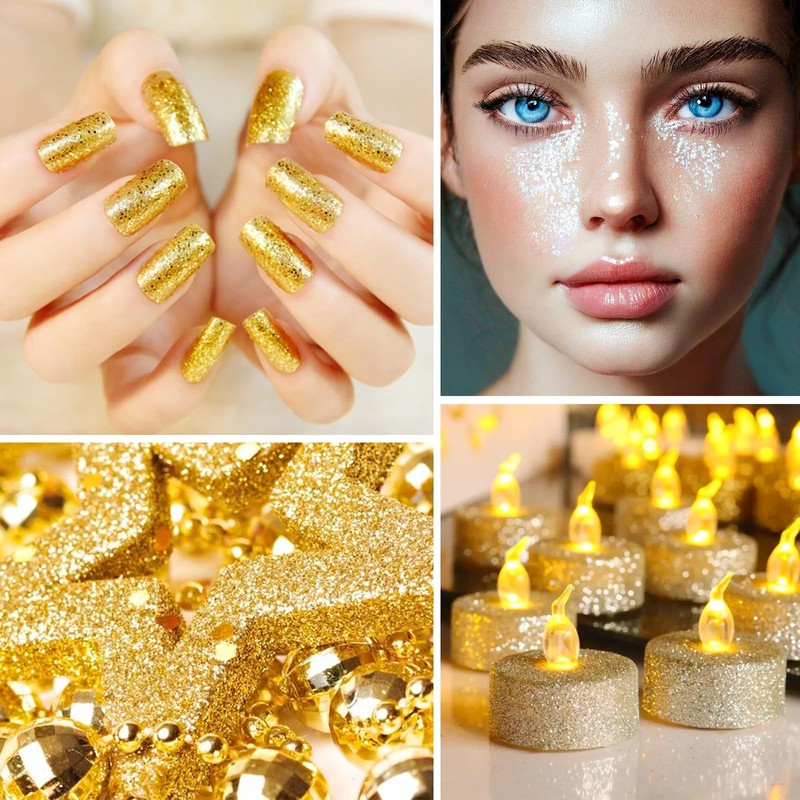 - GLITTER LONG LASTING SHINE: The high quality glitter powder adheres well to surfaces and lasts a long time, making it suitable for projects that require durability and longevity. Glitter gold glitter powder is easy to apply, whether you use it for make-up, crafts or nail art. It blends gently and evenly for professional looking results.