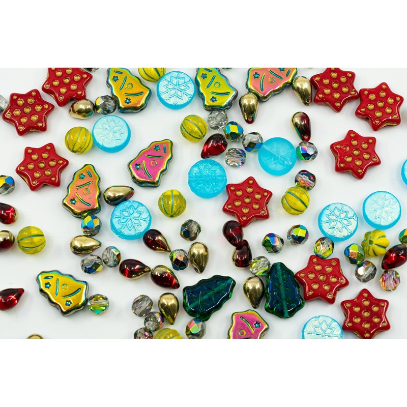 60 g of Christmas Czech Glass Bead Mix 2024 with Trees, Melons, Snowflakes and Faceted Beads, Dark Green Yellow Xmas
