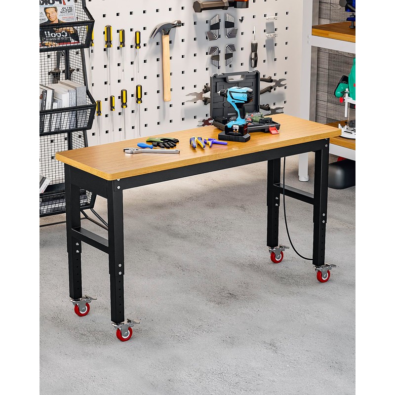 60" Heavy Duty Workbench with Wheels, Max. 2200 LBS Capacity Adjustable Height Solid Wood Work Bench Table, Work Bench Station for Garage, Shop, Home, Office