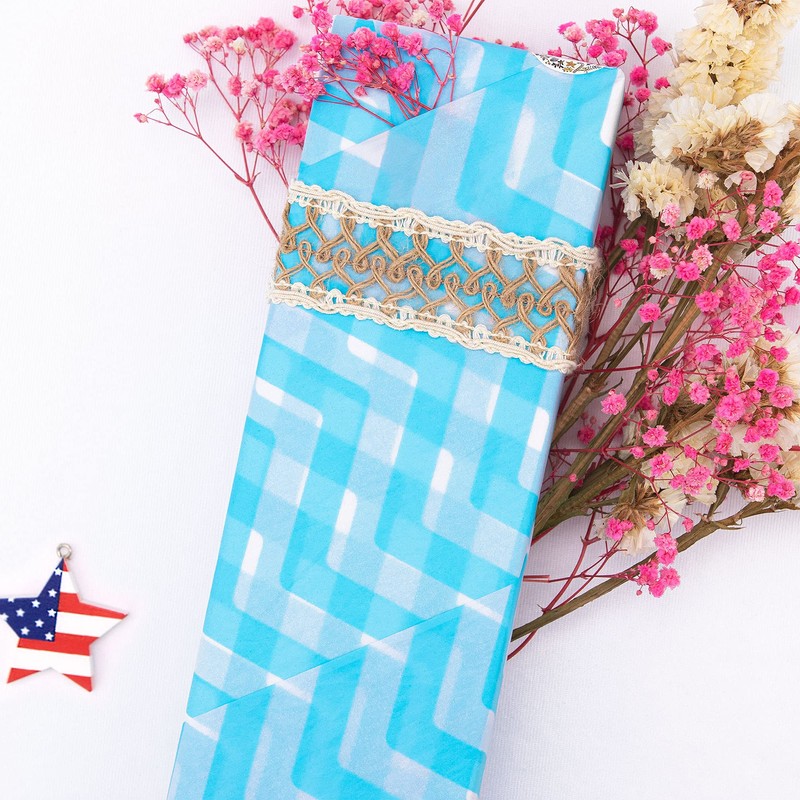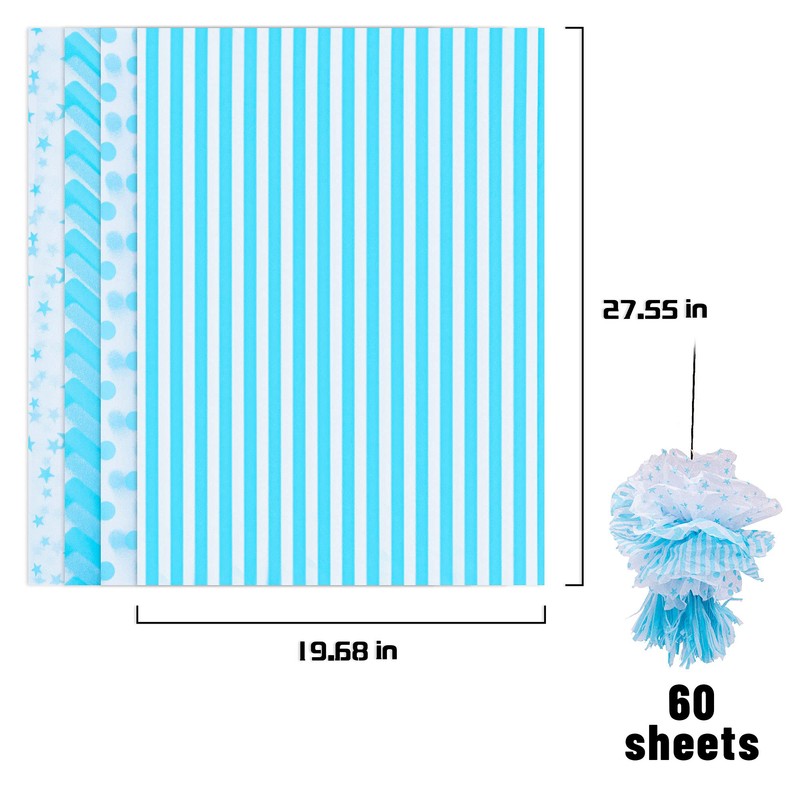 - El paquete incluye: 4 diseños de 60 hojas de papel de seda azul bebé, cada diseño 15 hojas. Tamaño grande: 50 x 70 cm, perfecto para regalos de tamaño regular y bolsas de regalo.