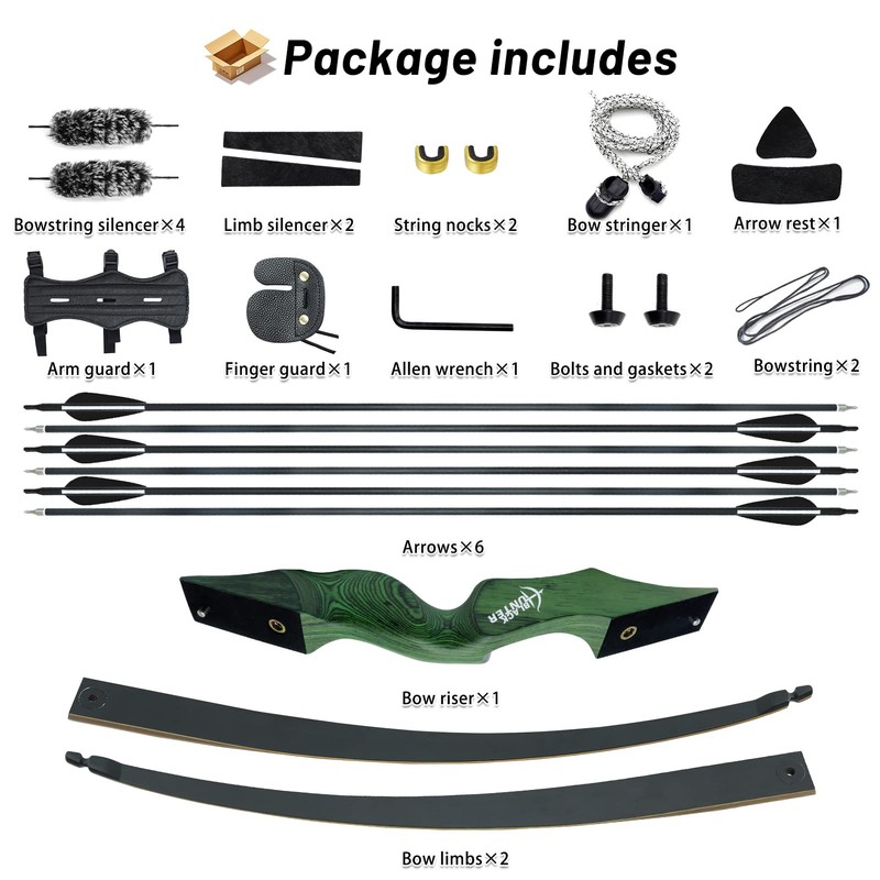 - What You Will Get:Bow riser X 1,Bow Limb X 2,Bowstring X 2,Bowstring Silencer X 4,Limb Silencer X 2, String Nocks X 2,Bow Stringer X1,Arrow Rest X 1,Arm Guard X 1,FInger Guard X 1,Wrench X 1,Bolts and GasketsX 2,Arrows X 6