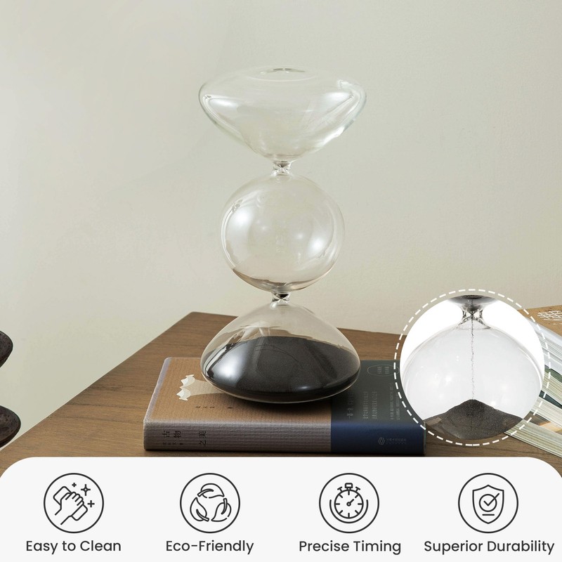 • 【Simple and Timeless Design】This hourglass-shaped 60-minute sand timer features contrasting clear hand-blown glass with trible globe design and is filled with black sand for an eye-catching appeal.