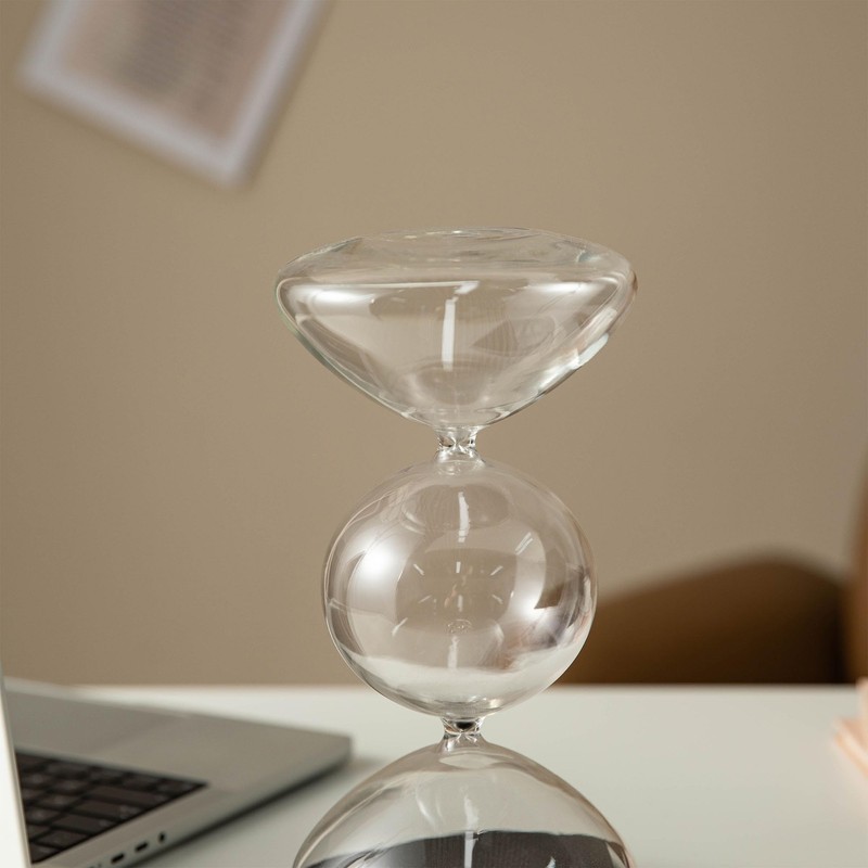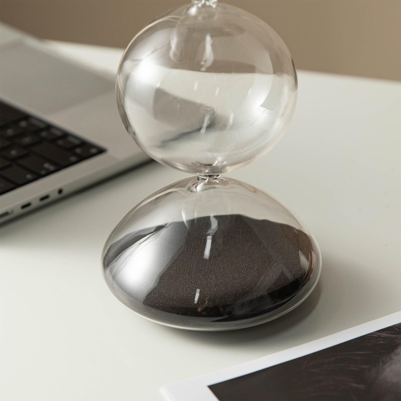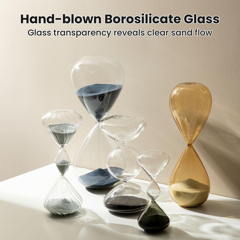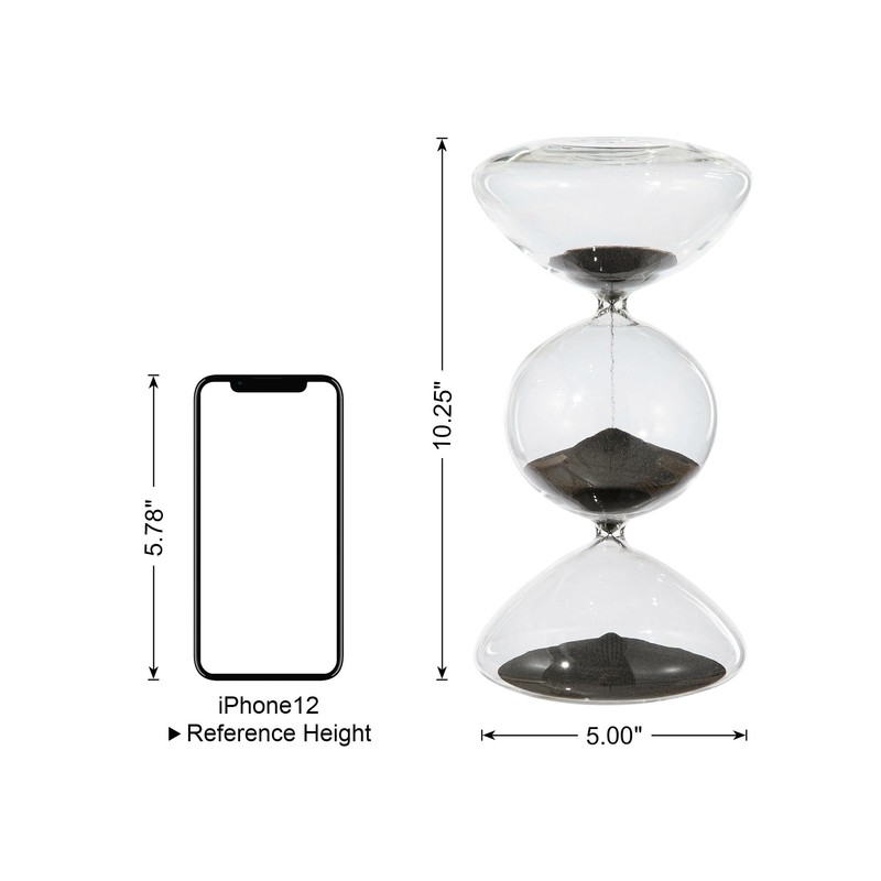 A contemporary take on a traditional timepiece, the sand timer offers a modern way to elevate your office, desk, or bookshelf. This hourglass-shaped 60-minute sand timer features contrasting clear hand-blown glass and is filled with black sand for an eye-catching appeal. This elegant symbol of time serves as a beautiful piece of art in any space. 1. Exquisite three-layer and black sand, with a 60-minute timing capacity. 2. Hand-blown borosilicate glass for superior durability. 3. Glass transparency reveals clear sand flow. 4. Versatile Multifunctional Use: perfect for desk decoration, kitchen timing, or office assistance 5. Easy to clean Note: 1. The hourglass has a timing error of about 10%, which is a normal phenomenon and is higher than the production standard of the hourglass industry. 2. It is normal for the sand to hang on the wall or get stuck, and it can be relieved by flicking the hourglass or putting it under the sun to ventilate. 3. The hourglass size is manually measured, and there will be an error of 0.1 to 0.5 inches.