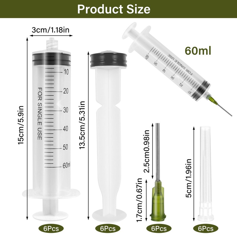 - Package includes: 6 x 60 ml plastic syringe with measurement, 6 x needles, 6 x needle caps, meet your needs in different scenarios, enough to meet your daily use and replacement.