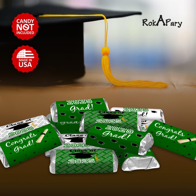 60 New Graduation Cap Party Class of 2025 Miniatures Candy Bar Wrapper, Mini Candy Chocolate Bar Stickers, Labels, Candy Not Included, Color Green. Made in USA