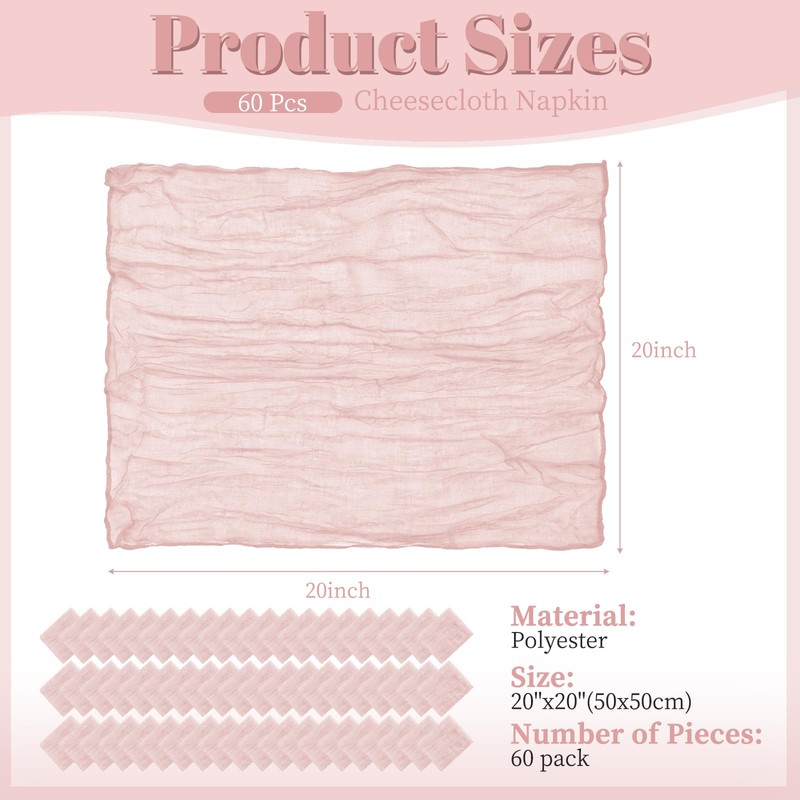 - Packing List: You will receive 60 packs dusty pink cotton and linen gauze napkins with wrinkled, approx 20" wide and 20" length.Sufficient quantity makes them available for weddings and parties, appropriate size makes them befitting for table use .And They are the perfect decoration for wedding table cloth, table runners etc.