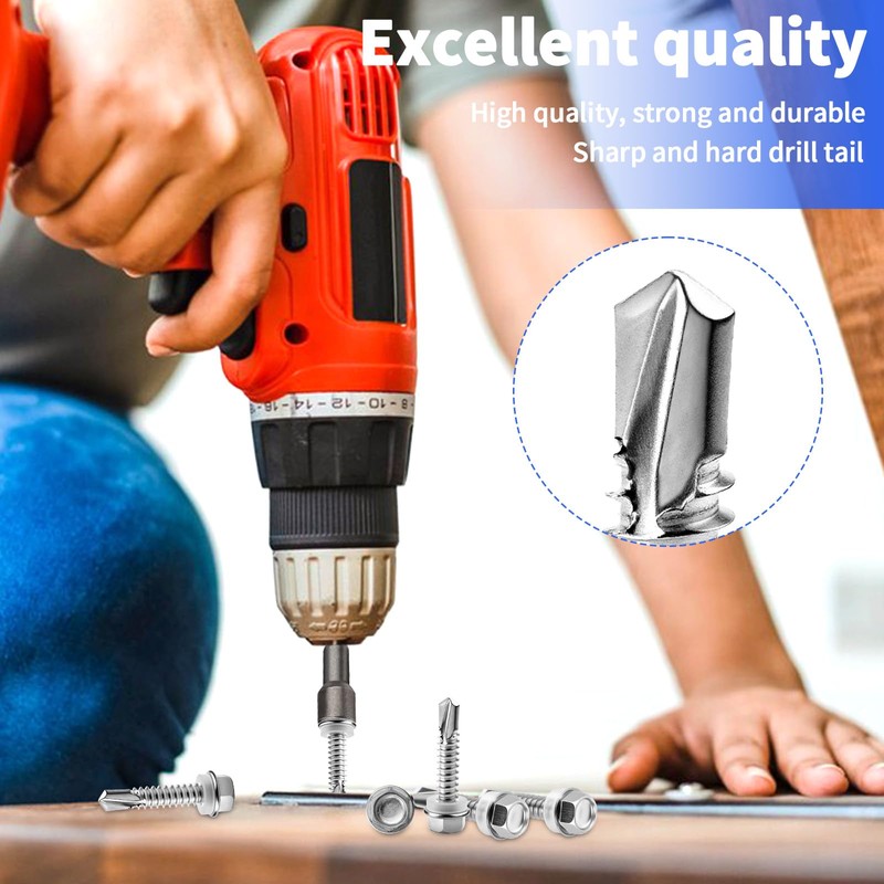 - 【Easy to Install】Self drilling screws for metal features a deep thread design, ensuring strong penetration and fastening power in different materials, achieving secure connections. Each hexagon-head self drilling screws is designed with a special tail, eliminating the need for pre-drilling, making installation quick and easy. Stainless steel screws can be directly driven into metal, wood, plastic, and other materials, making it an ideal fastening solution.