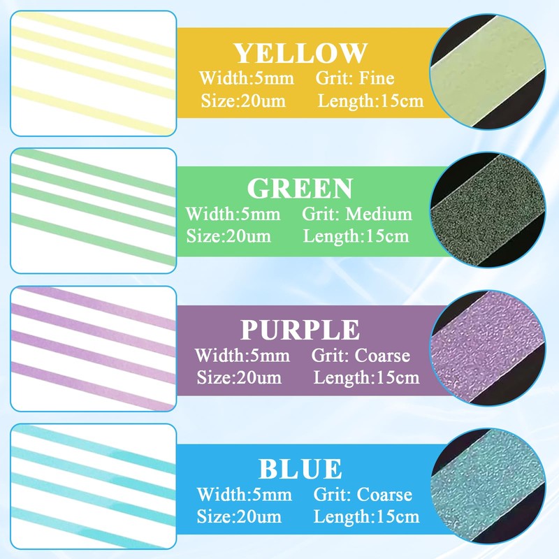 Colour tooth sandpaper: blue, purple, yellow, green.