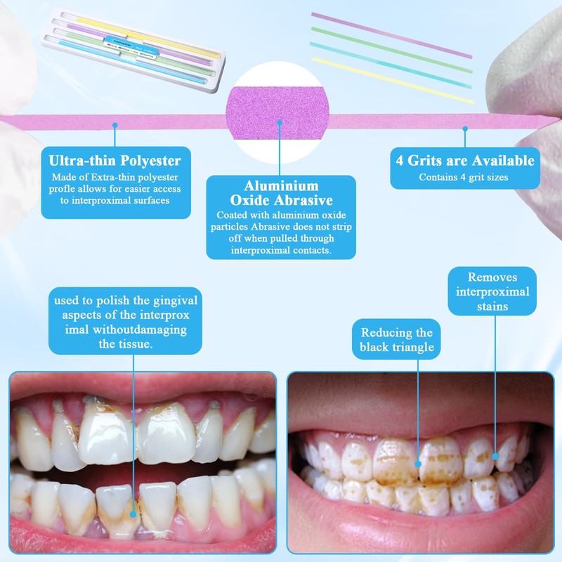 - Recreate a confident smile: This dental polishing strip has been specially developed for reshaping radiant, white and healthy neighbor teeth. Tooth sandpaper can not only carefully polish the surfaces of adjacent teeth to make them smooth and radiant, it can also thoroughly clean tooth stains and effectively remove a variety of them, treat stubborn stains and help you restore a confident smile.