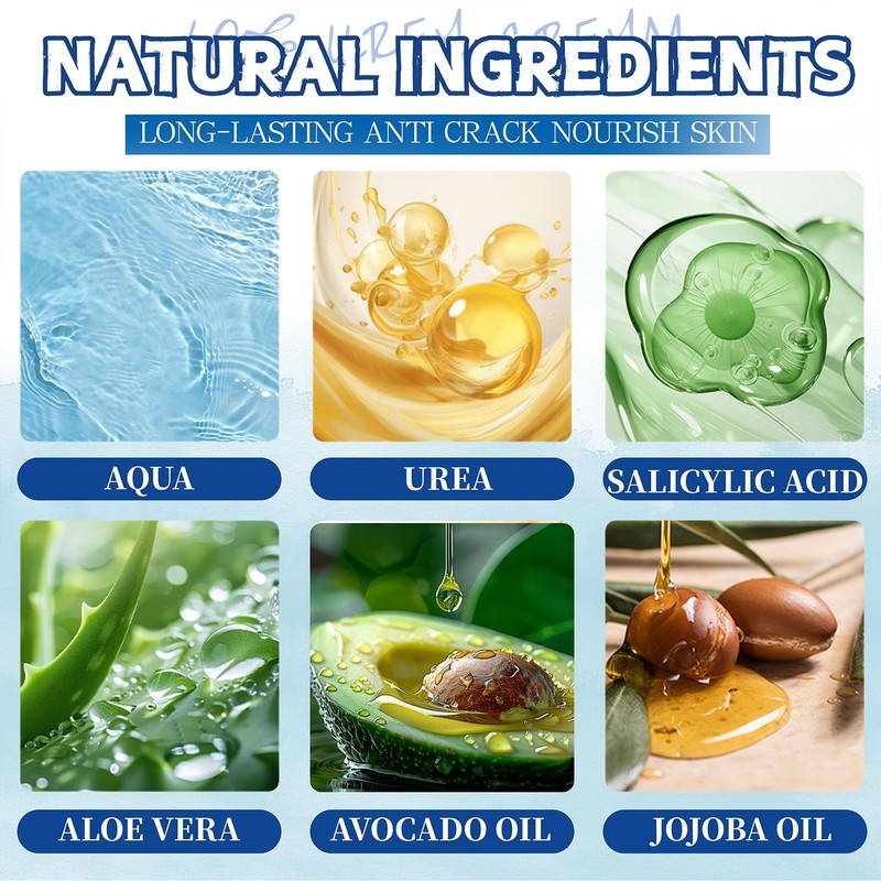 - Natural plant-based formula: Our urea cream combines urea, shea butter, hyaluronic acid, aloe vera extract and glycerin. These natural skin care ingredients are rich in soothing properties that soften and soothe skin during exfoliation, resulting in healthier and smoother feet.