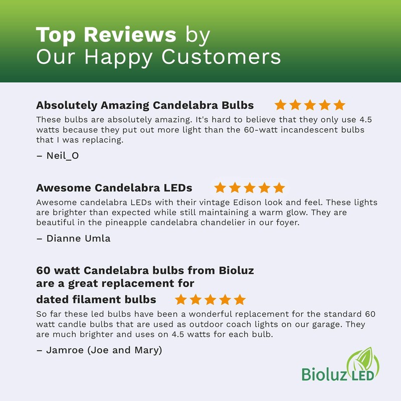Bioluz LED introduces it's most efficient LED ever! 60 Watts of equivalent light using only 5.5 Watts! We're proud to introduce the latest in our FILAMENT LED Series - an elegant and aesthetically pleasing DIMMABLE candle bulb for your chandeliers, ceiling fans, and other fixtures in your home. The Bioluz LED Dimmable Filament Candle LED is glass all the way down to the screw base - providing 360 degrees of bright 3000K light which will match your existing E12 / C37 incandescent bulbs - in fact - we believe you'll prefer them to your existing bulbs! Warm yet bright, but not harsh like other high Kelvin bulbs on the market. Bioluz LED offers beautifully styled lamps for your home and office. Warm and bright, Bioluz LED high performance lamps offer aesthetically pleasing designs combined with quality and energy efficiency. Add Bioluz LED energy efficient LED's to your home or office while maintaining the cosmetic beauty, brightness and color you've come to love. What are Lumens and Kelvins? Lumens are a measurement of how much light is generated - or brightness - each lumen emits approximately the same amount of light as one candle. Kelvin represents the "color" (which is based on the temperature) of the light. Bioluz LED's are manufactured so that our 2700 Kelvin bulbs are nearly identical in color to incandescent bulbs. Our 3000K bulbs are designed to match halogen bulbs. We've found that bulbs which are 4-5000K generates a bluish tint on objects (like at a hospital or office building) and are not as comforting in a home. Many brands sell and market higher Kelvin (4-5000) bulbs with lower lumens to make them "appear" brighter. Bioluz LED manufactures the correct color bulbs with exceptionally bright, energy efficient LED,s, so you get the color and brightness you're accustomed to without the harsh effect of higher color temperatures.