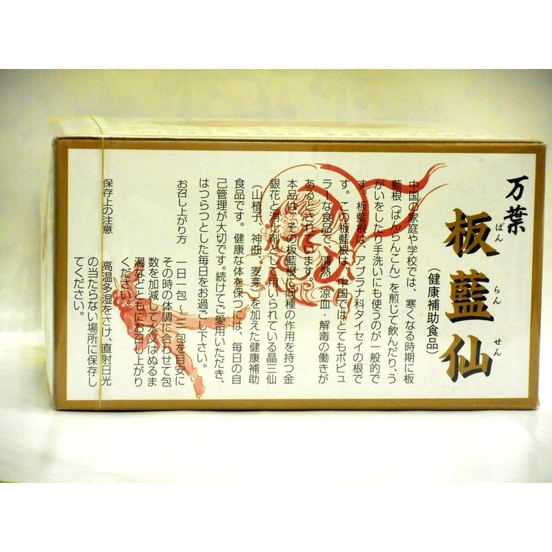【商品説明】 「万葉 板藍仙 60包」は、アブラナ科タイセイの根である板藍根(バンランコン)です。 本品は板藍根に金銀花と晶三仙(山ザシ、神曲、麦芽)を加えました。 健康は日頃の食生活の積み重ねが大切です。続けてご愛用いただきはつらつとした毎日をお送り下さい。 【お召し上がり方】 1日1-3包を目安にその時の体調に合わせて包数を加減して水又はぬるま湯などともお召し上がり下さい。 【保存方法】 高温多湿をさけ、直射日光の当たらない場所に保存して下さい。 原材料名・栄養成分等 ●原材料名:板藍根、金銀花、山ザシ、神曲、麦芽、桂皮、生姜、還元麦芽糖 ●栄養成分表(1包(2g)あたり):エネルギー 7.4kcal、たんぱく質 0.20g、脂質 0.04g、炭水化物 1.57g、ナトリウム 0.16g 【板藍根(バンランコン)とは】 アブラナ科のホソバタイセイの根のことです。中国ではなじみの深いハーブで、 多くの家庭に常備されています。お茶として飲用したりサプリメントとして摂取するなどして、 風邪の季節に重宝されています。 【麦芽とは】 麦芽とは、大麦を水につけて発芽させ、焙煎して乾燥させたもののことです。 大麦は、発芽によってアミラーゼの活性が強くなり、デンプンを糖に変えることができるようになります。 また、ビタミンやミネラルを豊富に含みます。 【生姜(しょうが)とは】 生姜にはジンゲロールやショウガオールという辛味成分が含まれます。生姜飴、生姜糖、 しょうが湯、生姜茶、ジンジャーエール、冬場では紅茶やスープなど食材や生薬として広く利用されおり、 近年では乾燥した生姜粉末も注目されています。 【サンザシ(ホーソンベリー)とは】 サンザシは中国北部のバラ科の植物で、鮮やかな赤色の姫リンゴに似た果実です。 キリストの冠に使われたといわれます。花には魔法の力があるとされるヨーロッパ原産の植物です。