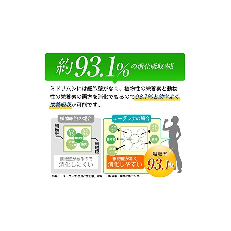 - 植物と動物両方の性質を持つ石垣産ユーグレナは、細胞壁がないため、その消化率は93.1%*を、他の素材に比べて群を抜いています。