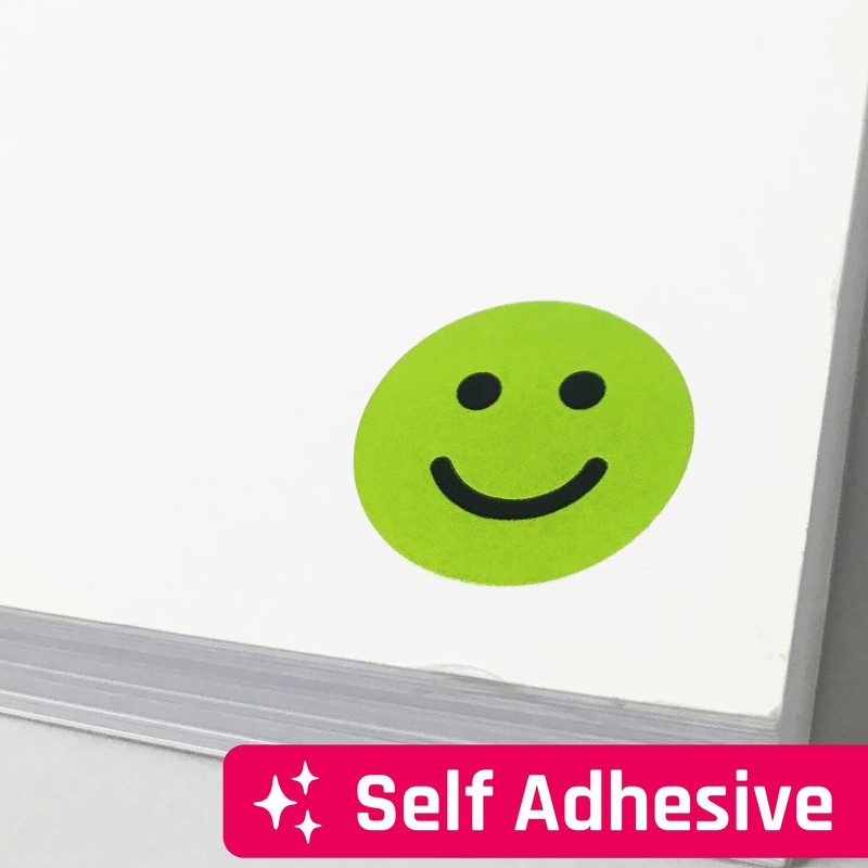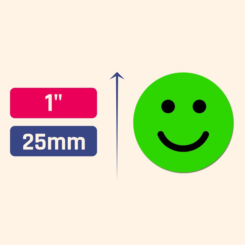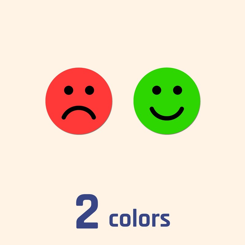 - Diameter: 1" (25 mm). Semi-glossy stickers with smiling and sad faces.