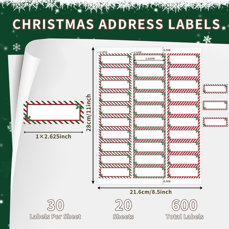 - Package included: you will receive 600 pieces of Christmas address labels, 30 pieces printable address labels on each sheet, a total of 20 sheets. These Christmas mailing labels showcase your new location and spread Christmas cheer, all while making sealing quick and easy, type your own text on this pretty Christmas address label template