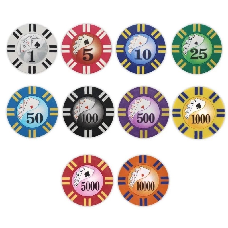 - Available in 10 colors/denominations: $1 white, $5 red, $10 blue, $25 green, $50 light blue, $100 black, $500 purple, $1000 yellow, $5000 pink, $10000 orange