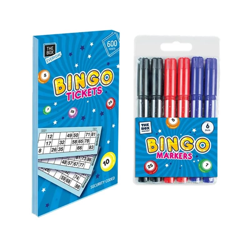 - Book of 600 bingo tickets plus 6 pack of bingo markers included