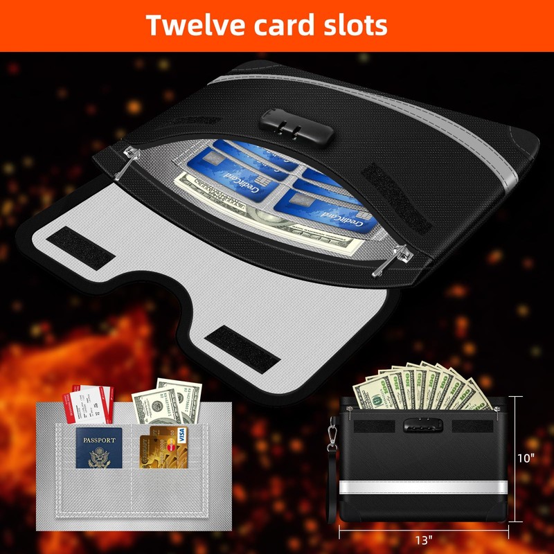- 【Professional Fireproof Document Pocket Protect Items】 New upgraded fire-proof document pocket made with 8 layers of fire retardant insulation and fire-retardant grade material crimped to easily pass UL 94 VTM-0 test. Perfect for use in home, office, travel, in case of emergencies such as storms, hurricanes, earthquakes, etc