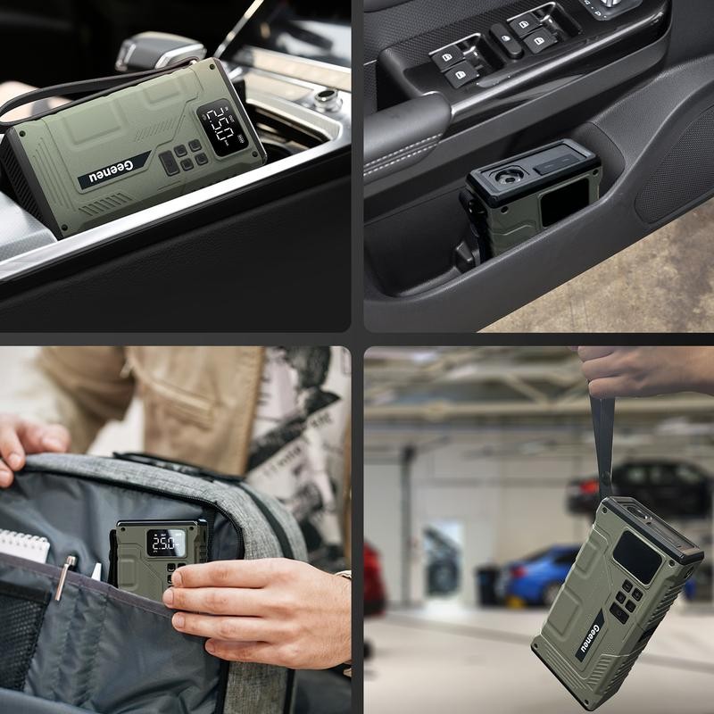 The Fix-it-All Set for Roadtrip: Each car owner should keep a jump pack in the trunk for emergencies in advance not when you're stuck by the roadside, if you didn't own a start jumper, then Geeneu portable jump starter for car is a gerat ideal for you. You'll get 1* jump starter with air compressor. 1* smart jumper cable, 1* charing cable,1* carry case, 1 * pump tube, 4* air nozzle, 1* user manual, 12 month warranty
