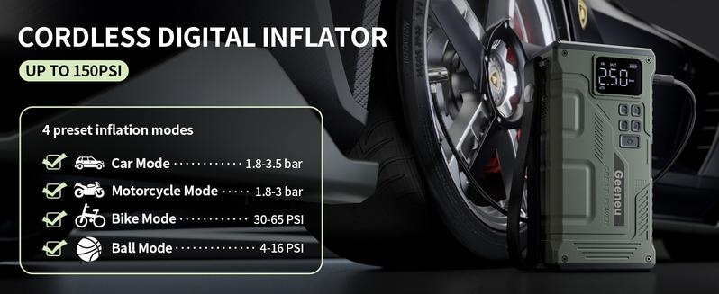 Jump Start & Smart Cordless Tire Inflator Combo: Beyond jump-starting a car in a jiffy, the jump starter power pack with tire pressure detection function, comes with 4 kinds nozzle to fill a flat tire(car tire/motocycle/bikecycle), balls, pool toys and air mattresses. Preset 4 pumping modes with an auto-stop feature for simplified operation
