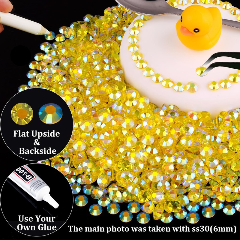 - 💎PACKAGE CONTENT -- Contains approximately 6000 pieces of 4mm-SS16(0.16") Transparent Lemon Yellow AB color bling resin rhinestones. Additionally, a tweezer and 1 pickup pencil are included for easy picking up of glitter gems.