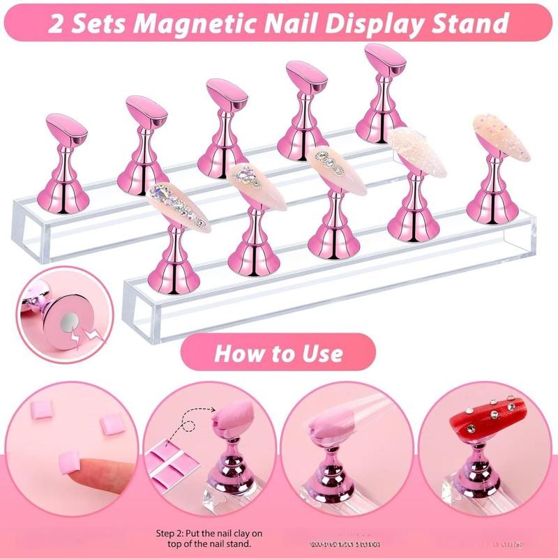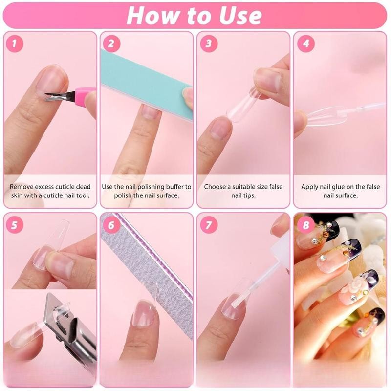 - • 【Acrylic Nail Tips Kit with Everything】Clear coffin nail tips set includes 600pcs full-cover coffin clear nail tips of 0-9 different sizes,10g false nail glue, 1pc pink acrylic nail clipper, 2 Sets 10pcs nail display stand, 1pc cuticle nail pusher, and cuticle trimmer pusher remover,10pcs reusable adhesive putty clay,1pc 100/180 nail file, and 1pc 400/4000 nail buffer. Super value clear coffin nail tips kit can meet the different needs help get attractive and fashionable nails at home • 【10g Nail Tip Glue】Acrylic false nail kits come with 10g false nail glue, Nail glue is made of ethyl cyanoacrylate, harmless to natural nails. The brush design is super easy and accurate to evenly apply on nails. Nail tip glue is very suitable for fake nails. Small nail art decorations, such as rhinestones, beads, glitter, and flakes, are compatible with all nail tips.Nail tip glues fast drying, fast bonding, and can last for a long time suitable for professional nail experts or nail learners • 【High-Quality Nail Tips】The coffin nail tips full cover includes 600 long coffin nail tips. Clear nail tips are made of high-quality ABS material, lightweight, durable, sturdy, and easy to trim. This is an environmentally friendly material, and won't harm your nails or body. Sizes from 0 to 9, and 10 different sizes are used for different nails, 50 pcs for each size, and you will get 100 pcs for sizes 5 and 6. Each nail tip is individually numbered, convenient to choose the most suitable size • 【Perfect Nail Partner】The cuticle nail pusher with the latest triangular tip design helps to accurately remove gel nail polish and cuticle. It can better remove the residue on the nail without the risk of hurting your nails. Nail file and nail buffer polish the nail surface to remove impurities and dead skin on the nail surface. Remove the fine lines on the nail surface and make the nail surface brighter • 【Come with Nail Art Display Stand】You will get 2 sets of pink acrylic nail art display stands. Each seat and base is equipped with a metal magnetic surface, and the magnet at the bottom is strong and durable. It is easier to fix the acrylic base and iron plate on the display stand. Nail display stands help to show your nail art, especially suitable for daily nail design and daily practice. It also comes with 10 pcs of white reusable sticky putty, which can help you make beautiful nails better