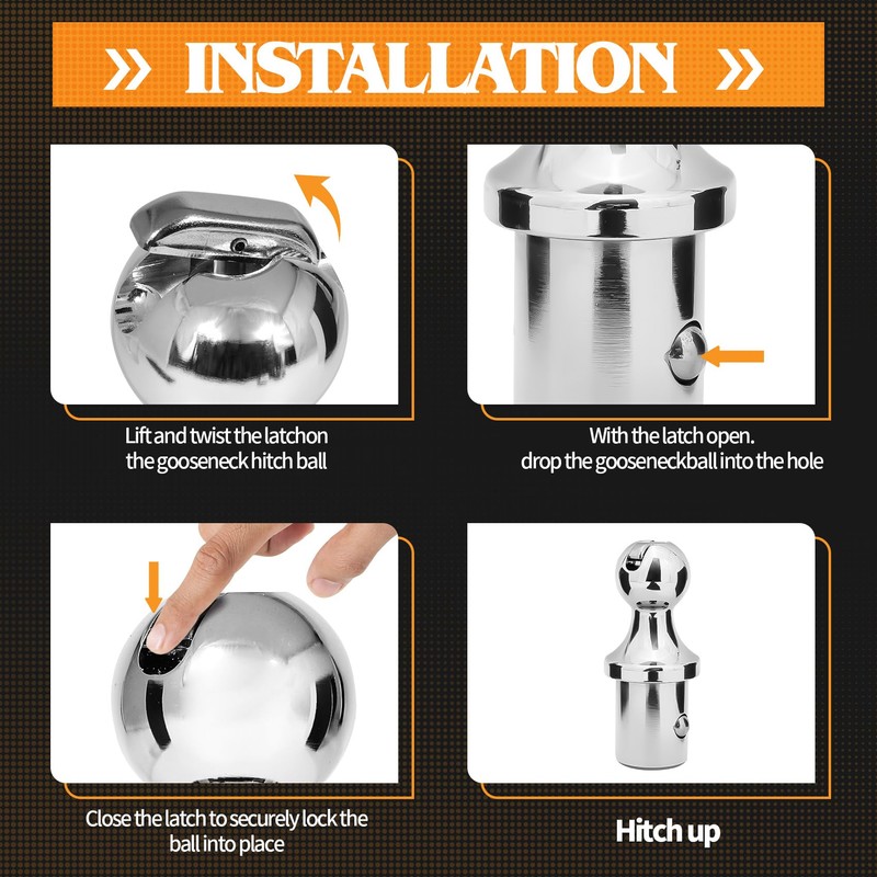 - Easy To Use: Our gooseneck trailer hitch ball kit can directly install it yourself, the same size as the original parts. The gooseneck hook adopts a plug-in installation method. The elastic ball locking device can firmly lock the gooseneck hook on the car. No tools are required for installation