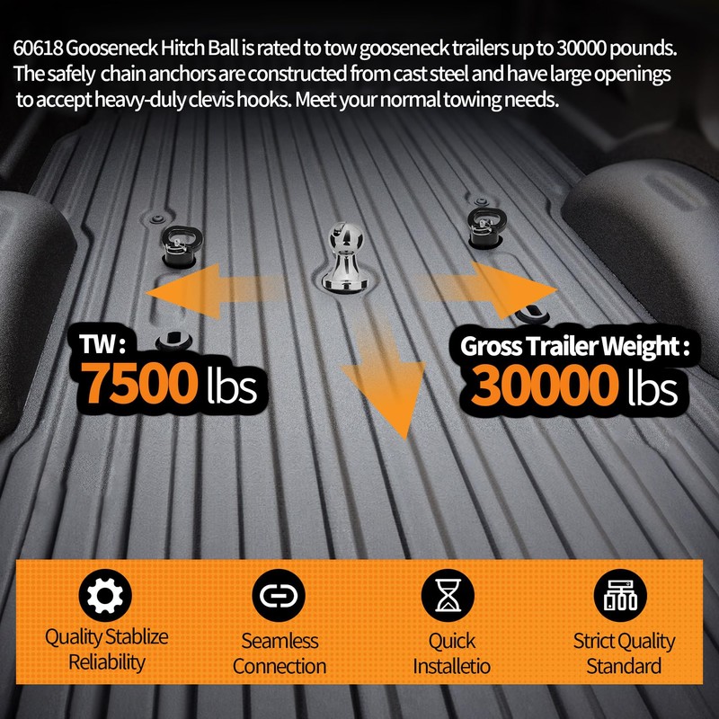 - High Performance: The gooseneck trailer hitch ball can withstand up to 30000 lbs of towing force. Vertical pulling power up to 7500 lbs. Hitch ball equipped with a large open anchor chain that can accommodate a heavy U-shaped hook
