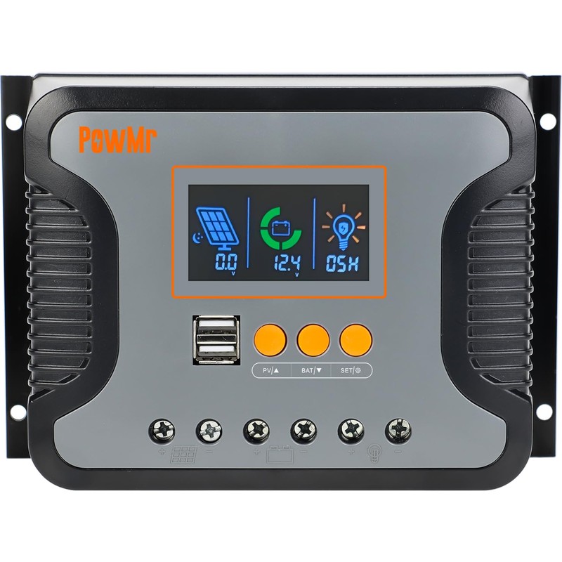 - 【EASY-READ BACKLIT DISPLAY】solar regulator built-in Backlight LCD Screen, real-time monitor, and control charging: charging current, generated energy, temperature, battery voltage, and error codes, fast and easily set and commit parameters; No matter how users switch display screen, it will automatically return to default display screen after no button is pressed for 100 seconds.