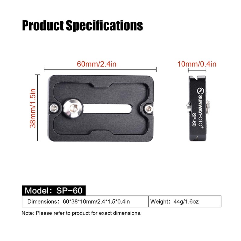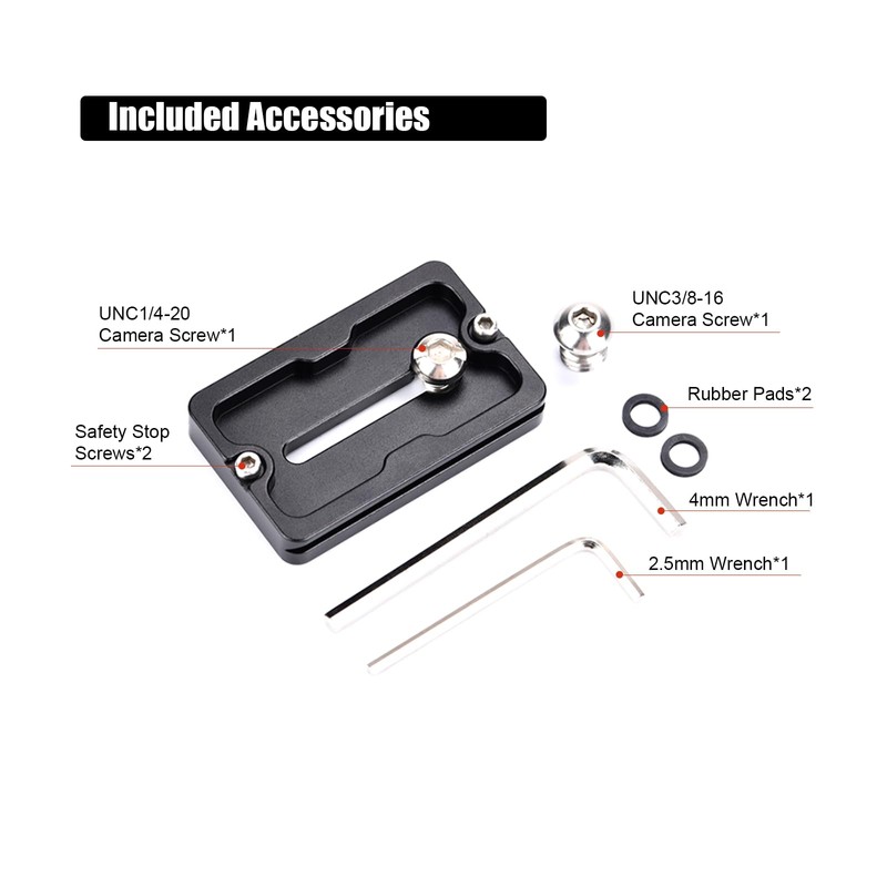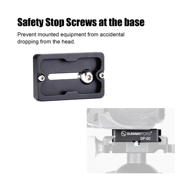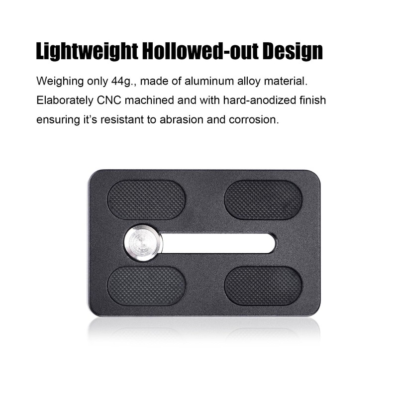 • Protective rubber pads on the plate protect the camera base from scratches, and work with cameras of different brands in spite of the tolerance on screw hole depth.Safety stop screws at the base to effectively avoid accidental dropping of the camera.