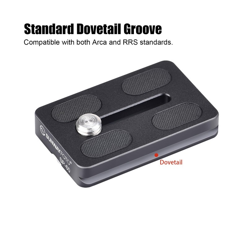 • Standard Dovetail Groove, compatible with Arca and RRS QR clamps.Dual-screw Captive Slot, compatible with cameras of different dimensions.
