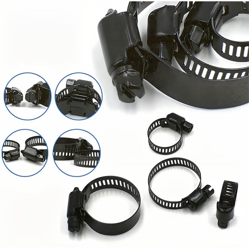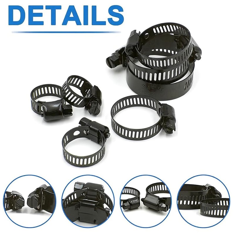 - 【Size and Quantity】This black worm gear hose clamp set has 7 different sizes for you to choose, including 6-12mm (12pcs), 10-16mm (10pcs), 13-19mm (10pcs), 16-25mm (10pcs), 19-29mm (10pcs), 18-32mm (4pcs) and 21-38mm (4pcs) 1 double head screwdriver.