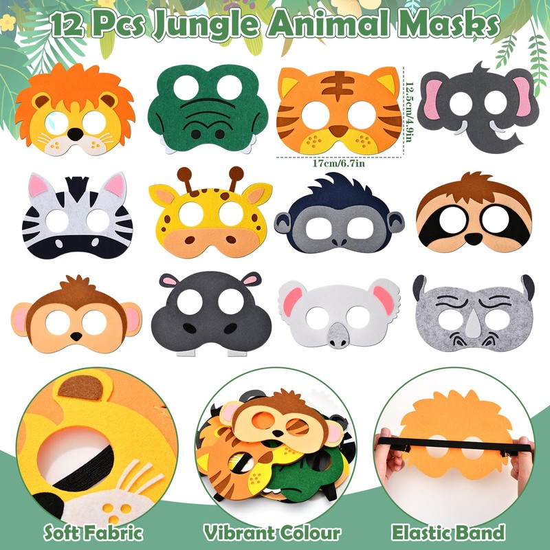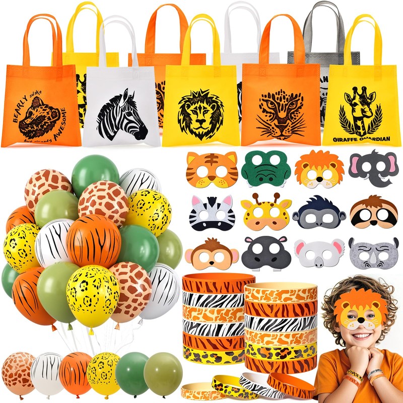 - A COMPLETE PARTY EXPERIENCE: This 48pcs set combines the best of party decorations and favors. Not only do they add unique animal pattern balloons, they also come with felt animal masks and silicone bracelets, and they come with a non-woven bag to store your favorite favors after the party. These items are perfect for any safari birthday supplies, making your party stand out and ensuring every guest feels like they are part of the safari adventure