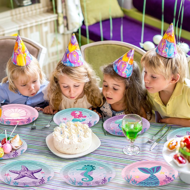 Our mermaid theme birthday party pack is completely disposable,mermaid birthday party dinnerware plates just thrown away after use, which reduces clean-up time so that you will have more time spare with your friends and family.