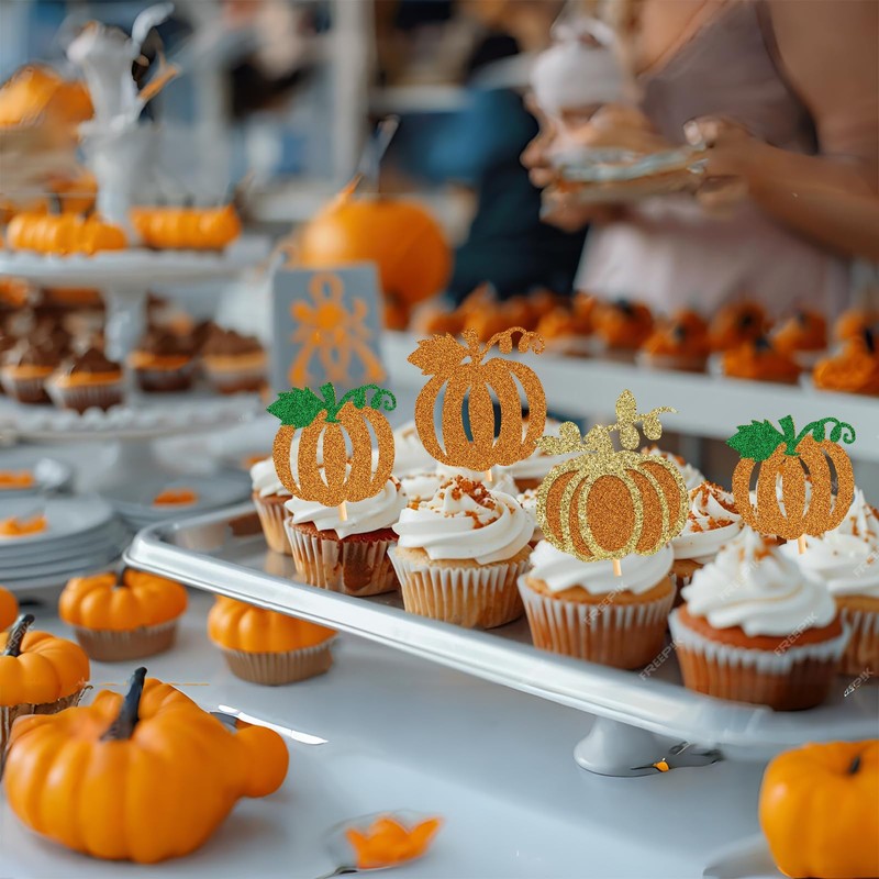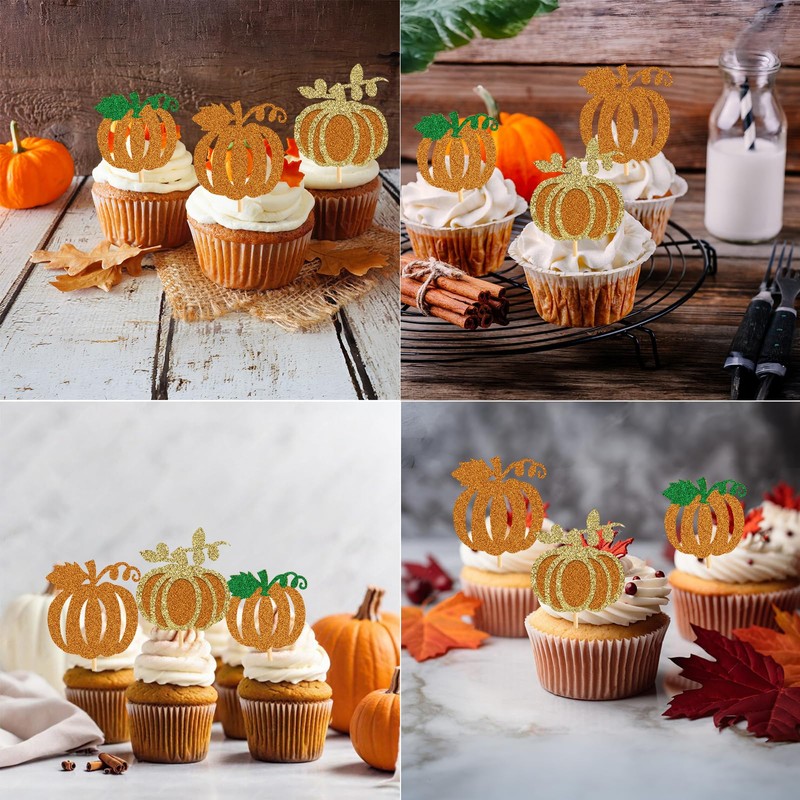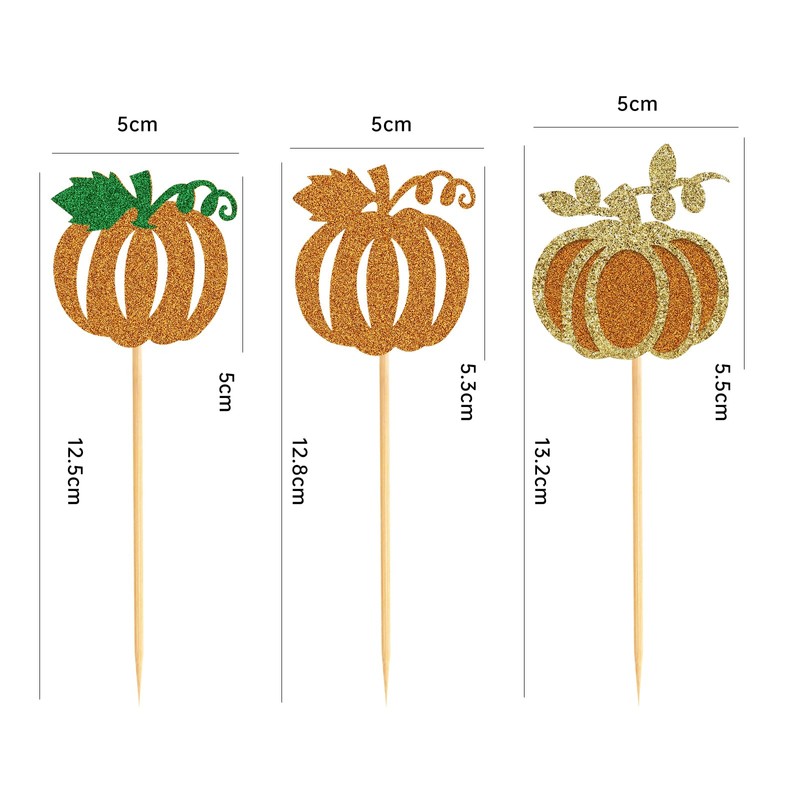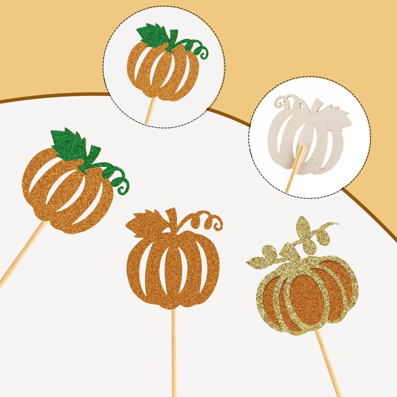 - MATERIAL-The Pumpkin Cupcake Topper is made of glitter paper and wood stick, smooth edges without burrs and very easy to put them on cakes, cupcakes, ice cream, fruits, pie, dessert, cheese or any dish and food appetizer you want to decorate.