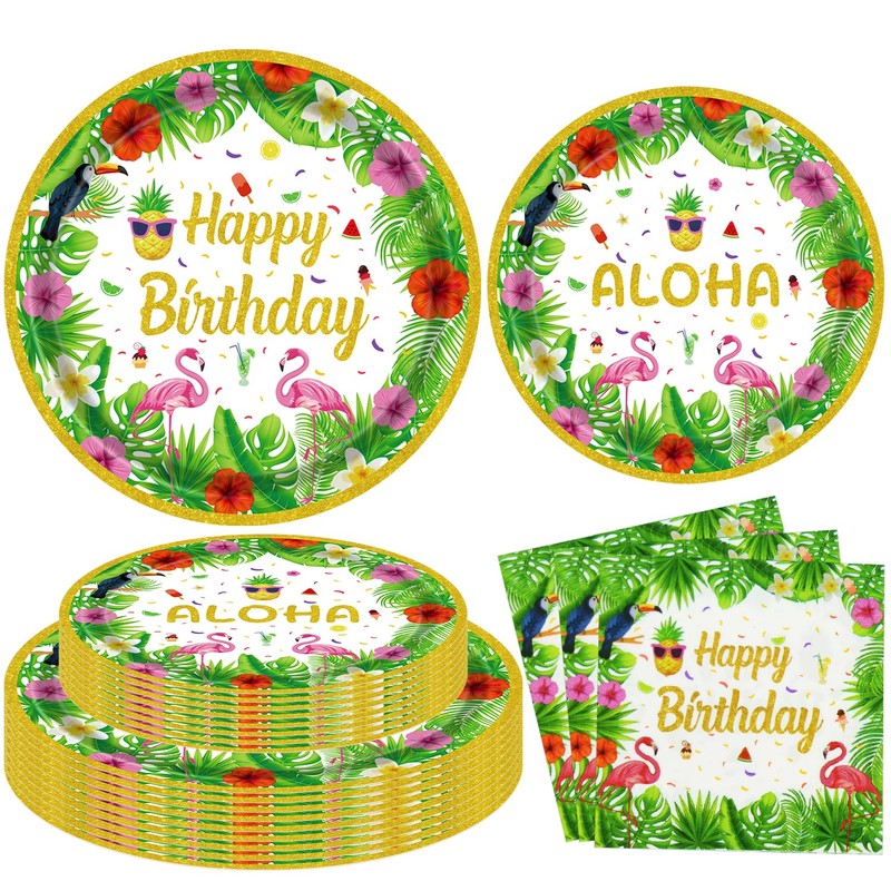 - Package Includes: 20 x 9” dinner plates; 20 x 7” dessert plates; 20 x napkins. These tropical paper plate sets can serve 20 guests at most, and make sure you have enough for a grand day celebration or great for daily use. It is a perfect complement to your tropical supplies, which makes your party or event more attractive to people, making party decor stand out so all your guests will be happy. The ultimate choice for creating an unforgettable celebration and party to it!