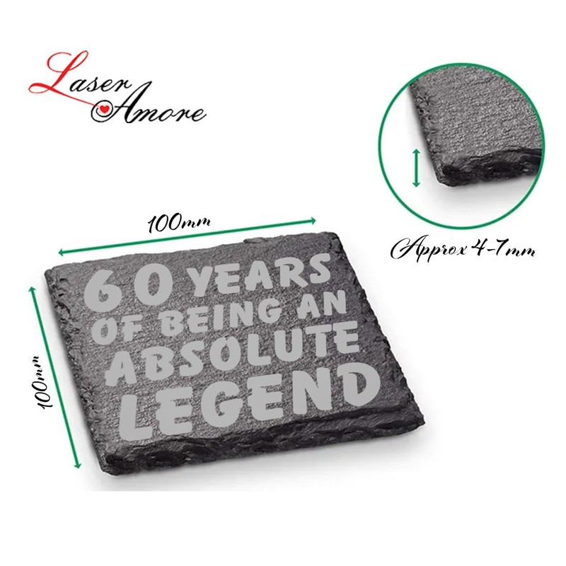 - *Legend* Engraved with quote " 60 years of being an absolute legend". perfect compliment to women's 50th birthday presents to celebrate the BIG 60 birthday with a joke decor coaster