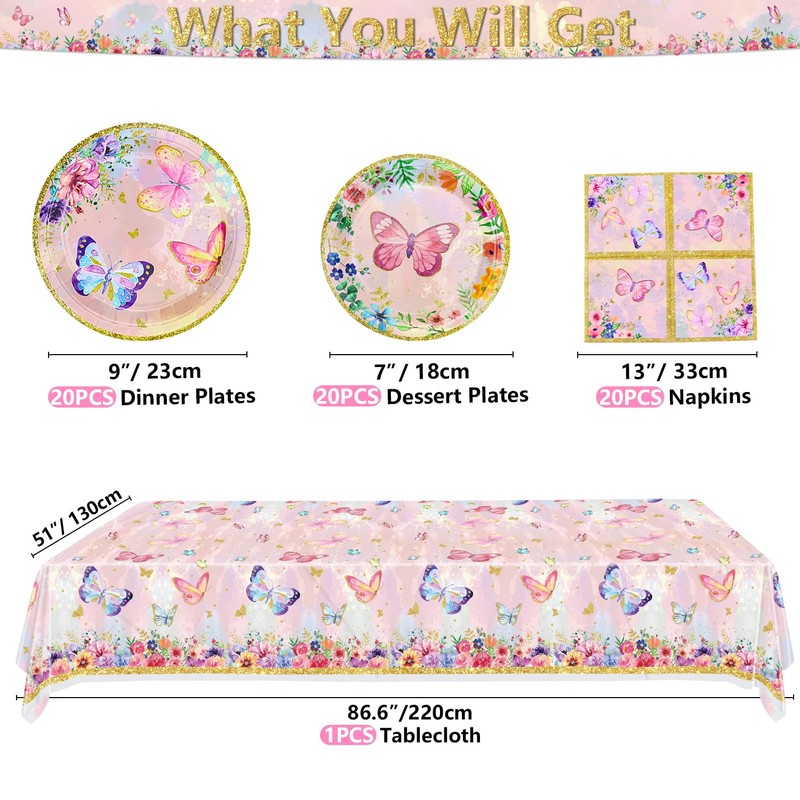 - Package Includes - The butterfly kit includes 20 x 9" dinner plates, 20 x 7" dessert plates, 20 x butterfly napkins, 1 x butterfly tablecloth.