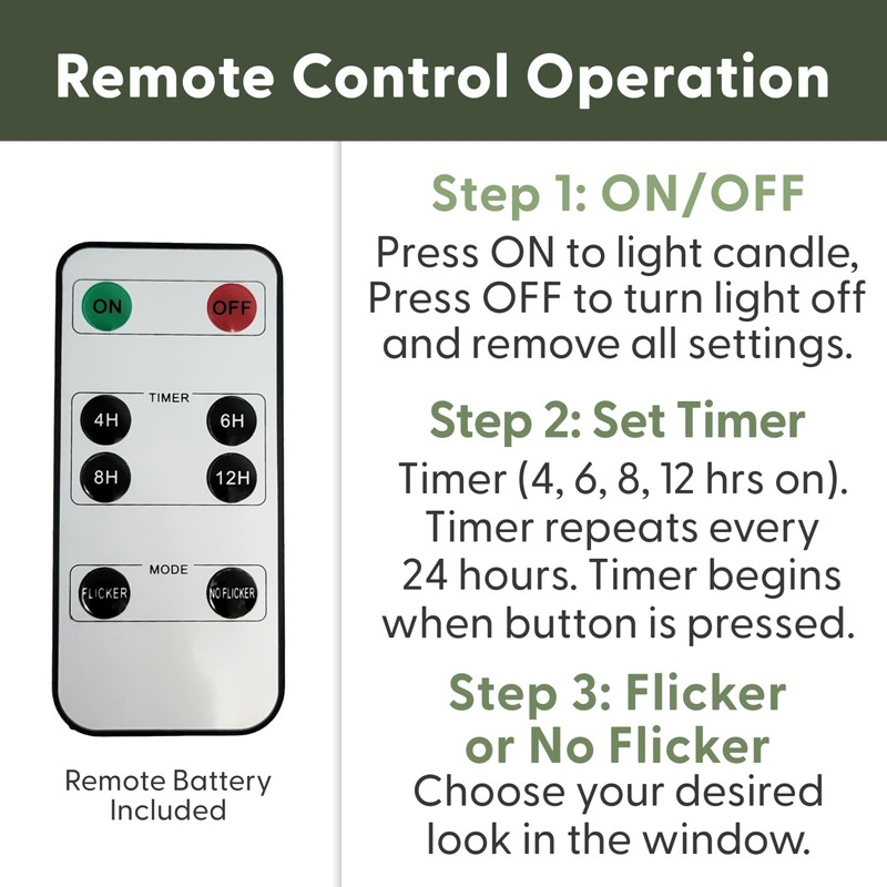 - The remote control allows the user to control the automatic timer cycle, flicker or steady light, and on/off functions.