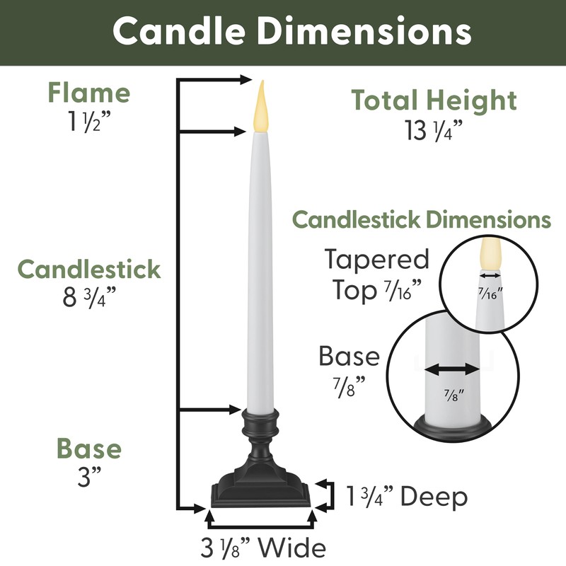 - Measures: 13 1/4” tall, 3 1/8” wide, 1 ¾” deep. Candlestick diameter: 7/8”