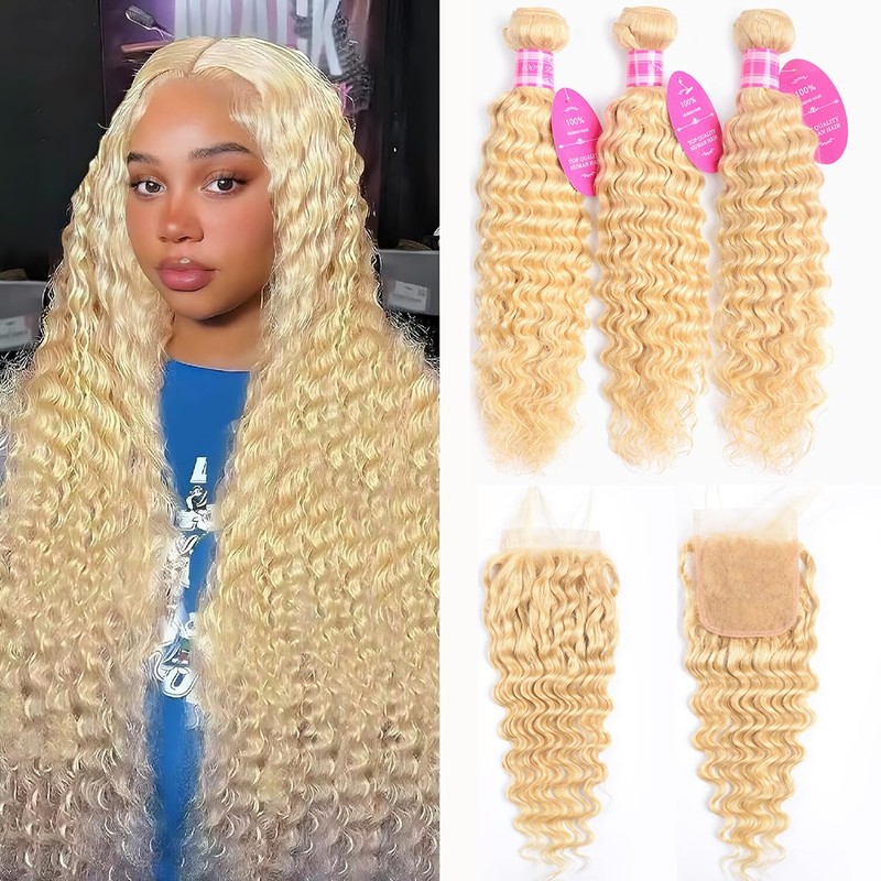 - 2.613 Blonde Deep Wave Human Hair Bundles With Closure Quality: High Quality Loose Wave 3 Bundles with Closure, No Shedding, No Tangles, Full Ends, Double Strong Weft, Soft and Silky.Lace Closure:4x4 Lace Closure Free Part, Hand Made Swiss Lace Closure ,Invisible & Natural Hairline.
