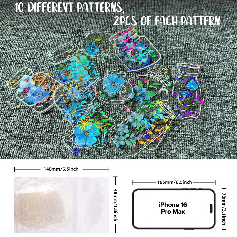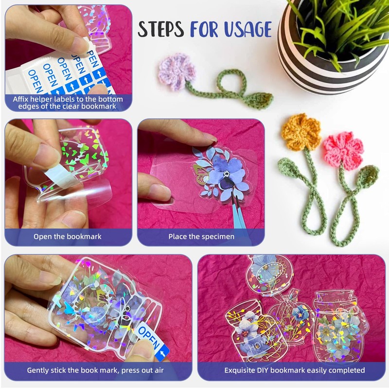 - Diy Bookmarks Sleeves Clear:20 pcs acrylic bookmark blanks in the shape of glass bottles and wishing bottles(10 pcs shapes sprout bookmark with 2 sheets of each shape).40 pcs pressed flowers for crafts stickers(20 pcs shapes with 2 sheets of each shape),one tweezer,30 pcs open tags.