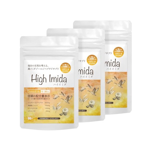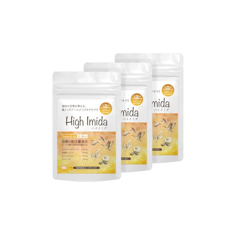 イミダゾールジペプチド 6300mg 高含有 サプリ 国産 黒ニンニク ビタミンB1 ヒハツ GMP認定工場 ハイイミダ 90粒入り 【3袋 約90日分】