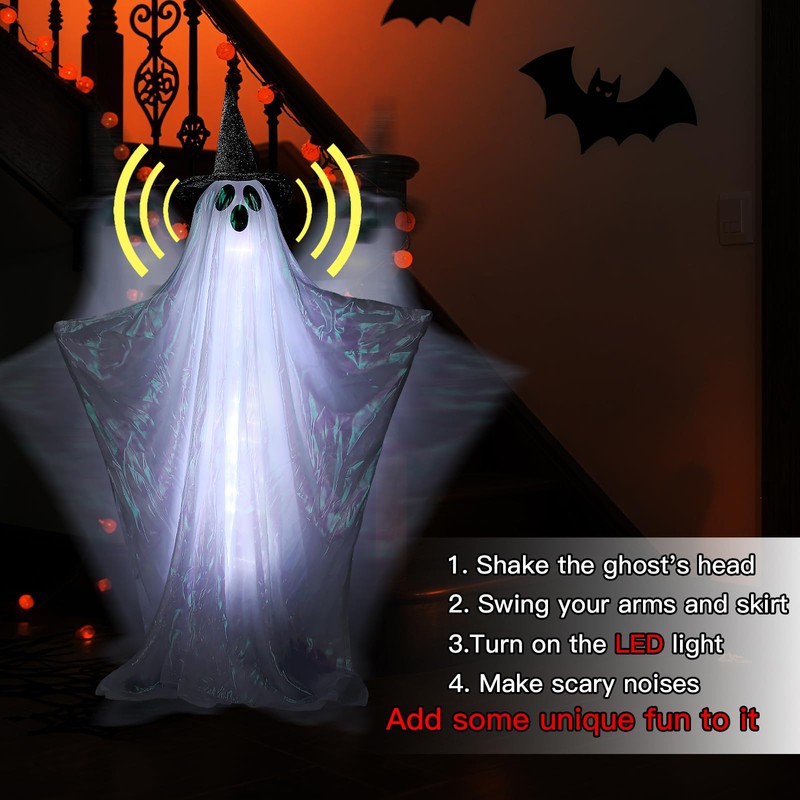 - [ Glowing Lights & Screaming Sound Effects ] - The built-in LED lights cast an eerie glow, while the ghost emits creepy sounds and screams to scare and entertain. A “Try Me” button is included for easy sound and motion activation during setup or display.